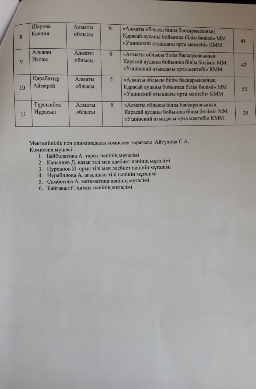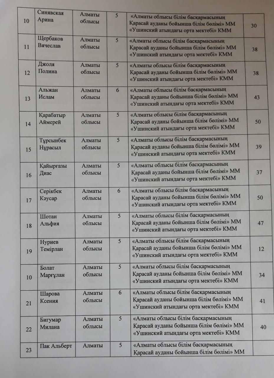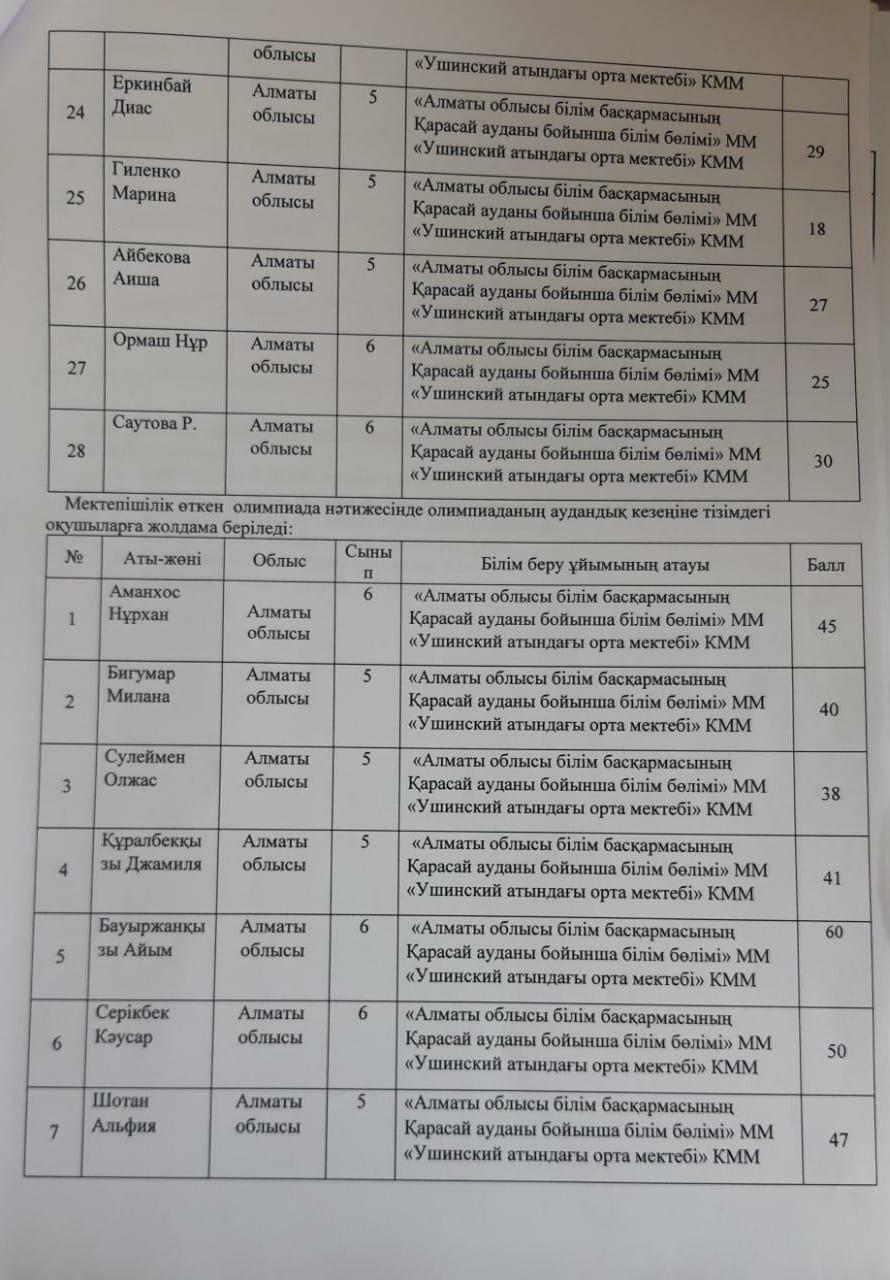 "Жетісу дарыны" облыстық дарынды және талантты жастарды анықтау мақсатынлағы пән олимпиадасы » "Алматы облысы білім басқармасының Қарасай ауданы бойынша білім бөлімі" мемлекеттік мекемесінің "Ушинский атындағы орта мектебі" коммуналдық мемлекеттік мекемесі