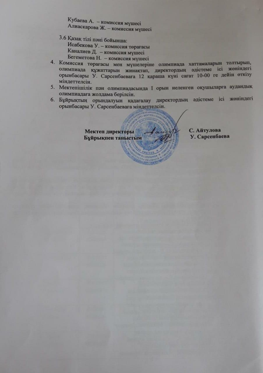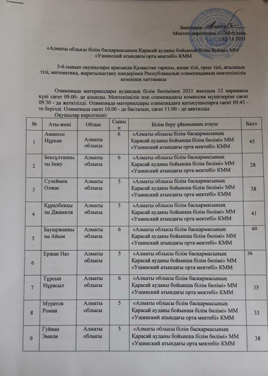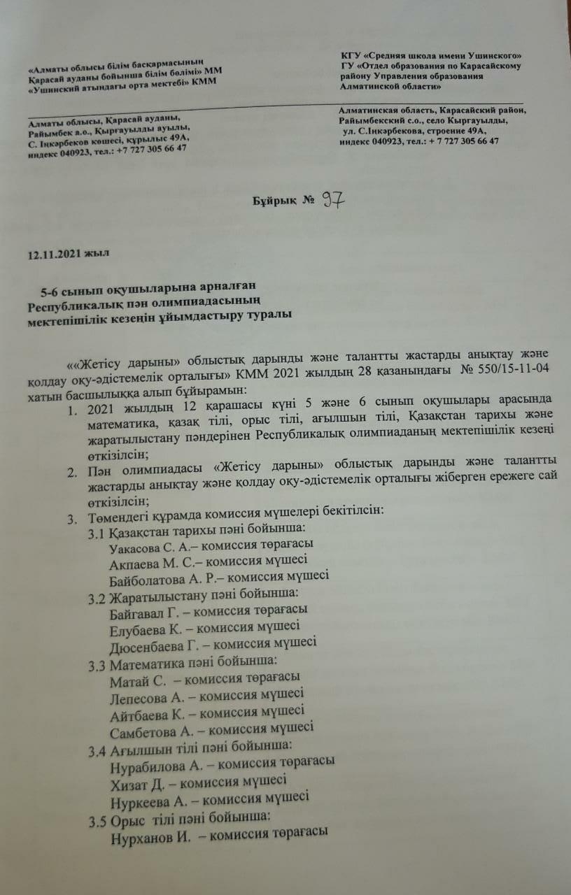 "Жетісу дарыны" облыстық дарынды және талантты жастарды анықтау мақсатынлағы пән олимпиадасы » "Алматы облысы білім басқармасының Қарасай ауданы бойынша білім бөлімі" мемлекеттік мекемесінің "Ушинский атындағы орта мектебі" коммуналдық мемлекеттік мекемесі