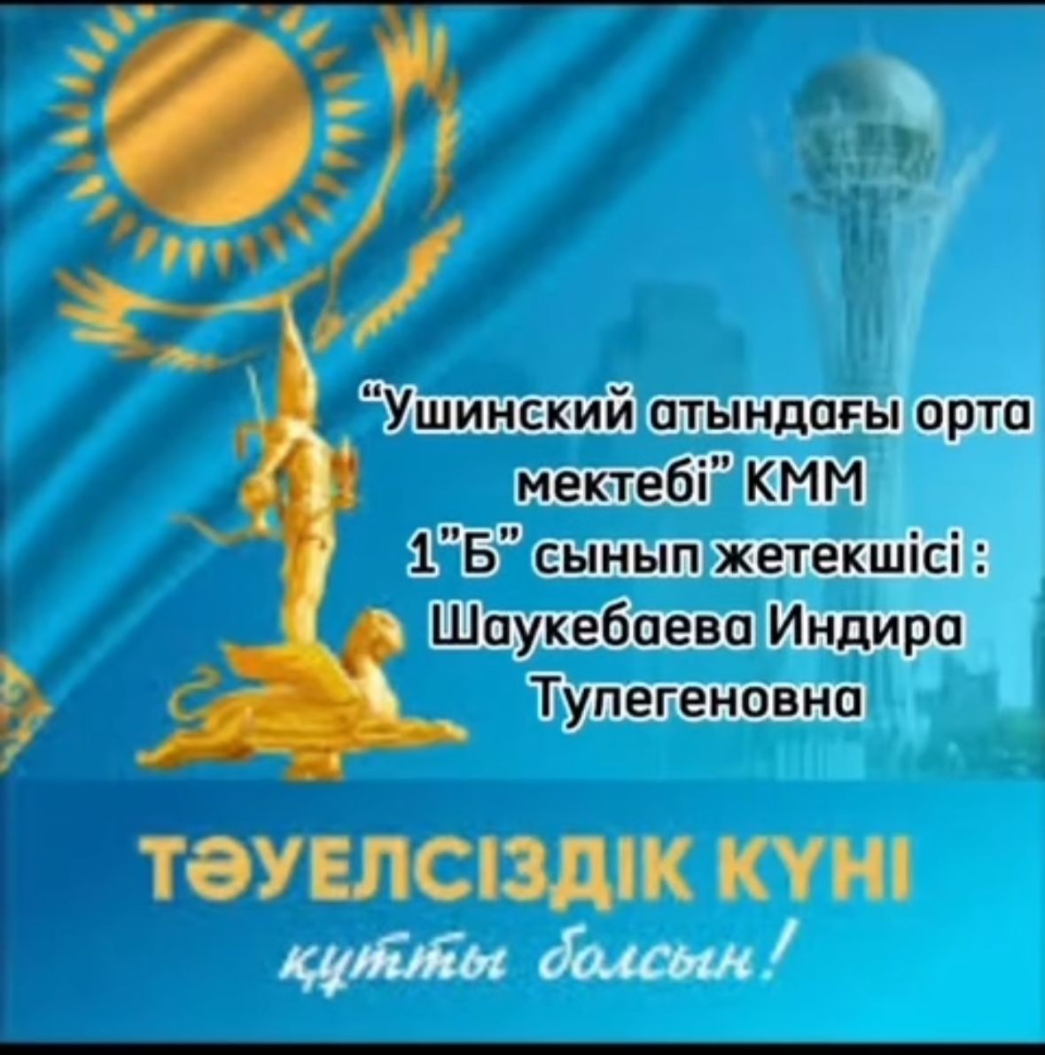 Тәуелсіздік күні құтты болсын! » "Алматы облысы білім басқармасының Қарасай ауданы бойынша білім бөлімі" мемлекеттік мекемесінің "Ушинский атындағы орта мектебі" коммуналдық мемлекеттік мекемесі