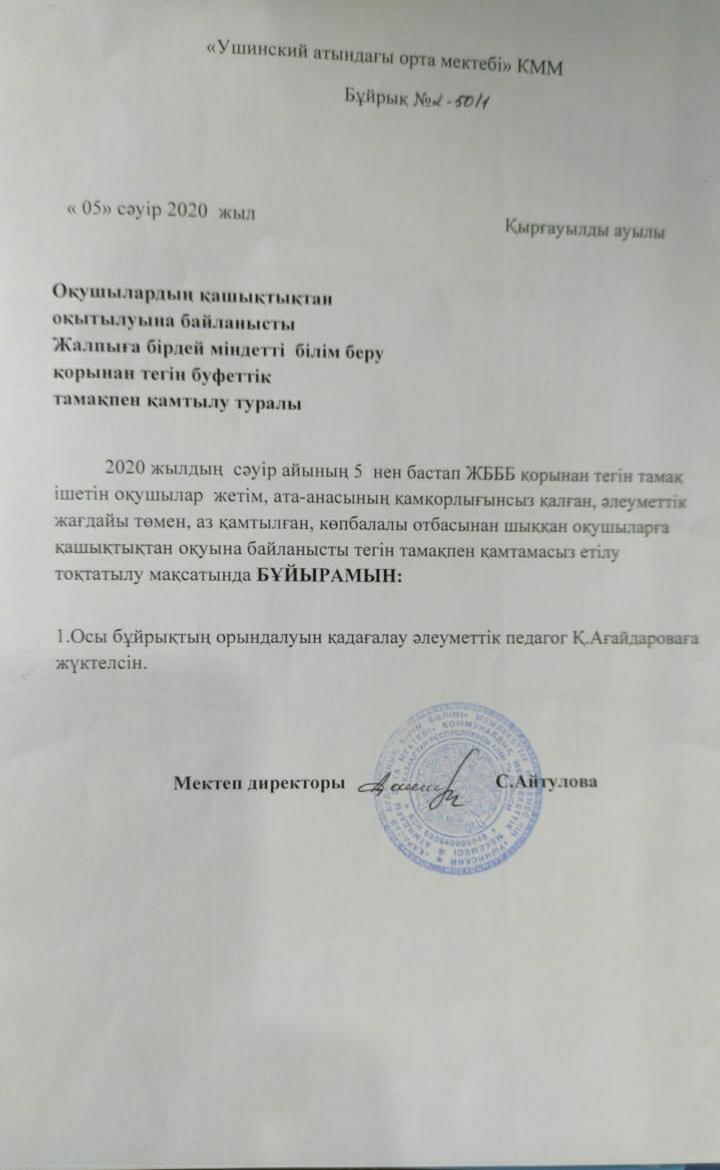 Тамақтану » "Алматы облысы білім басқармасының Қарасай ауданы бойынша білім бөлімі" мемлекеттік мекемесінің "Ушинский атындағы орта мектебі" коммуналдық мемлекеттік мекемесі